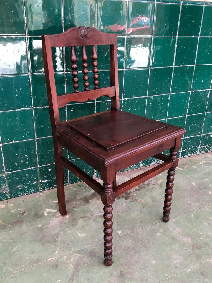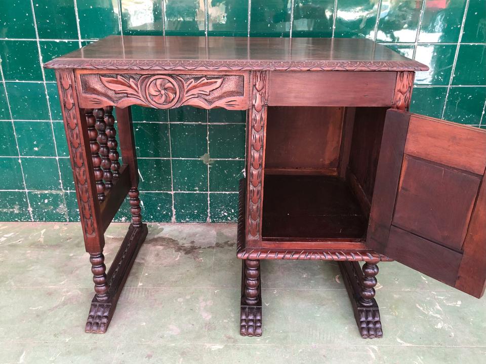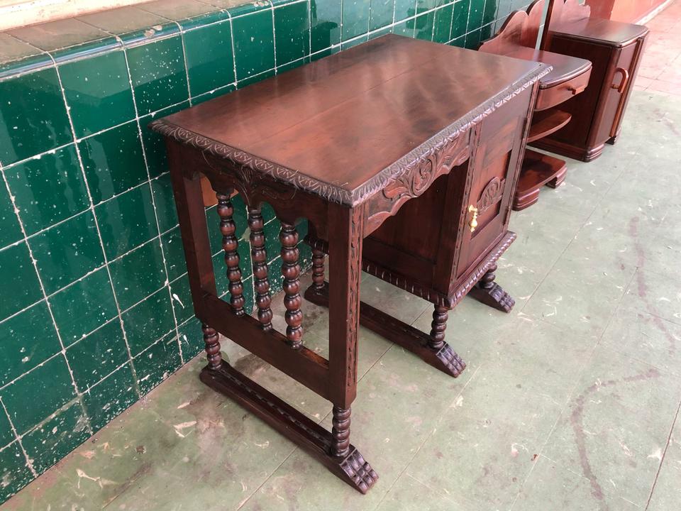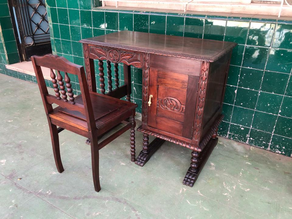 Buró (escritorio) antiguo con su silla, acabado de restaurar. No tiene gavetas y cuenta con una puerta para que guardes tus cosas en el interior.