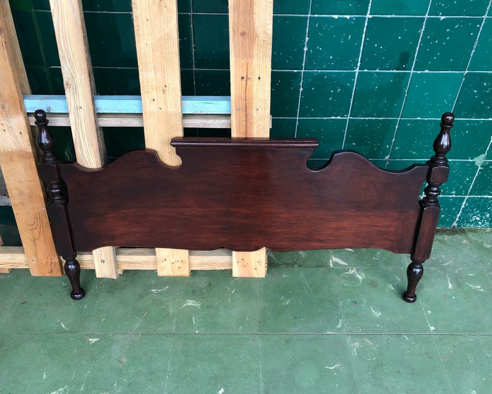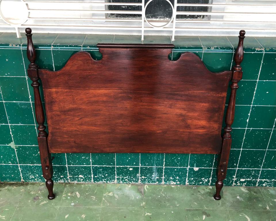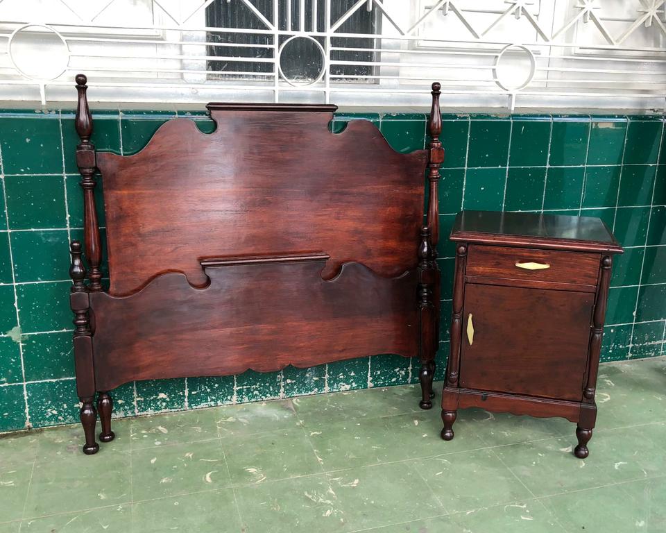 Cama personal estilo Colonial con una mesita de noche, acabada de restaurar. Tiene su bastidor de madera.