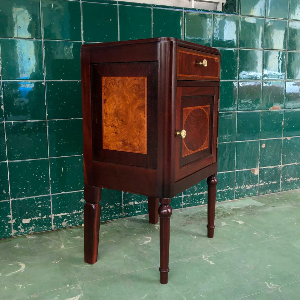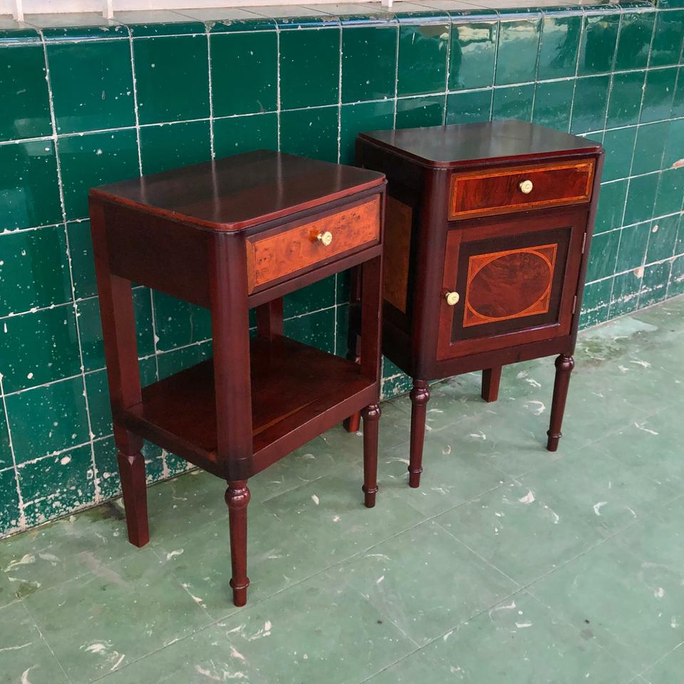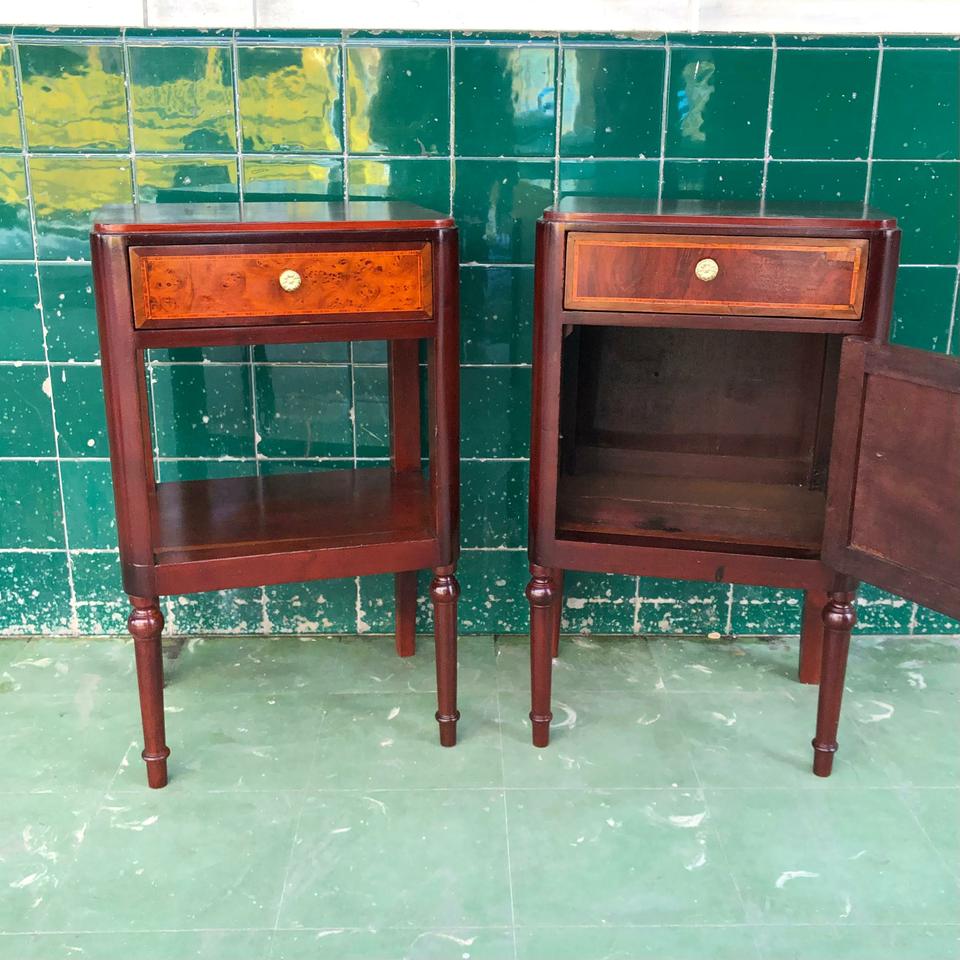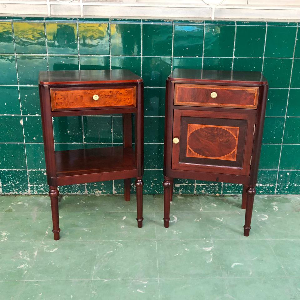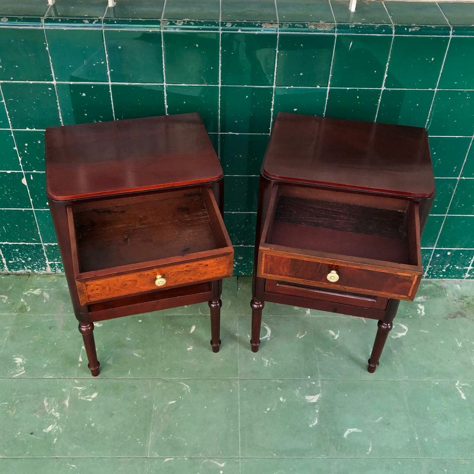 Pareja de Mesitas de noche estilo Imperio, acabadas de restaurar. Con trabajo de plumilla y marquetería.