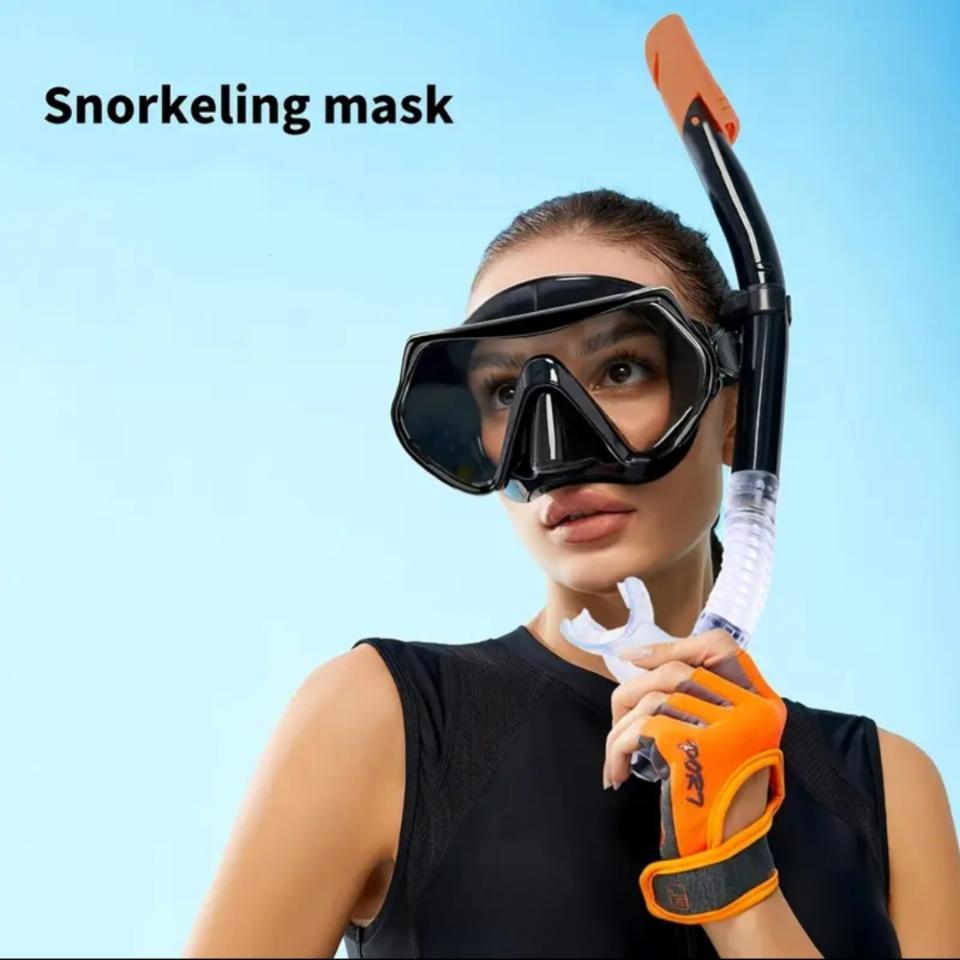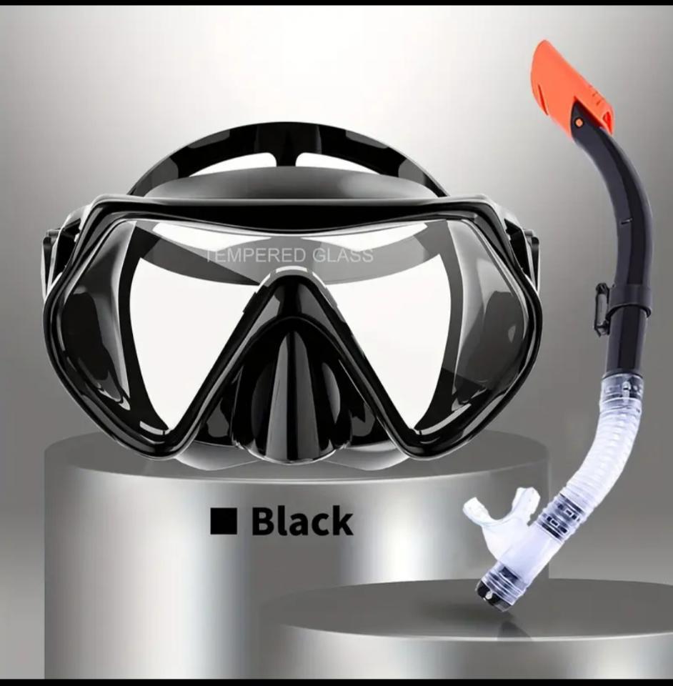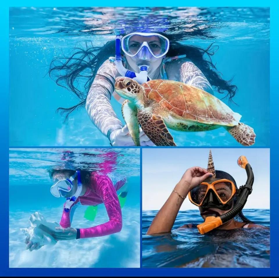 Set de buceo con máscara de amplió cristal panoramico y Snorkel. Ambos en silicona de alta calidad. Máscara con doble sello y cristal templado.