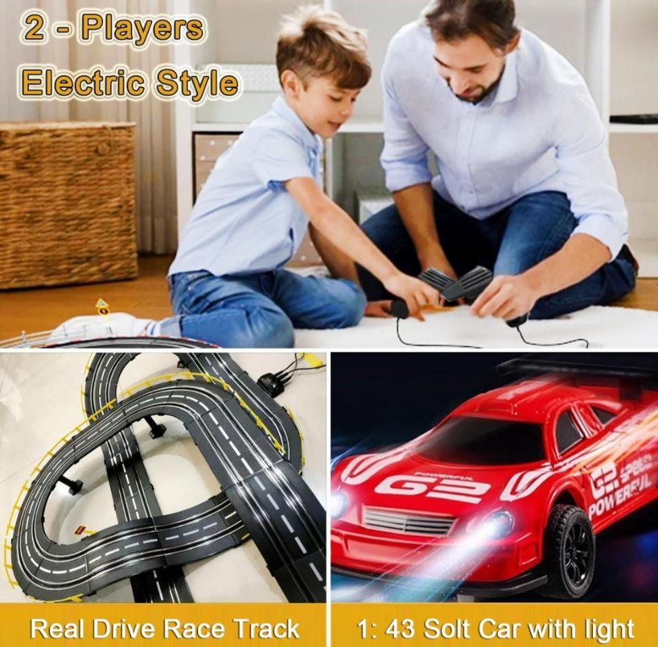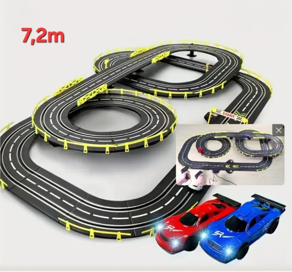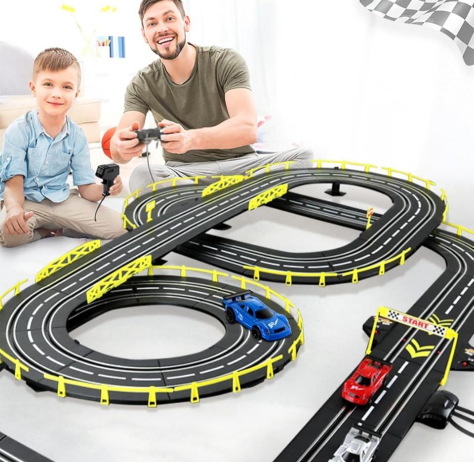 Juego de pista con 2 carros de carrera de alta velocidad con funcionamiento y aceleración mediante control remoto. Enseña conceptos básicos de la conducción, cómo es disminuir la velocidad en curvas o volcas el carrito. Es recomendable para niños mayores de 5 años y adolescentes. Se alcanza alta velocidad.