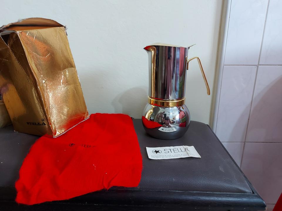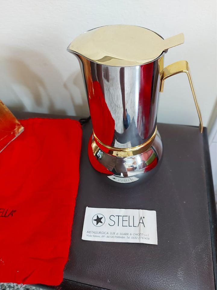 Cafetera Stella original italiana de lujo de acero inoxidable cromado y dorada, de 10 tazas. Pago en divisa o equivalente.